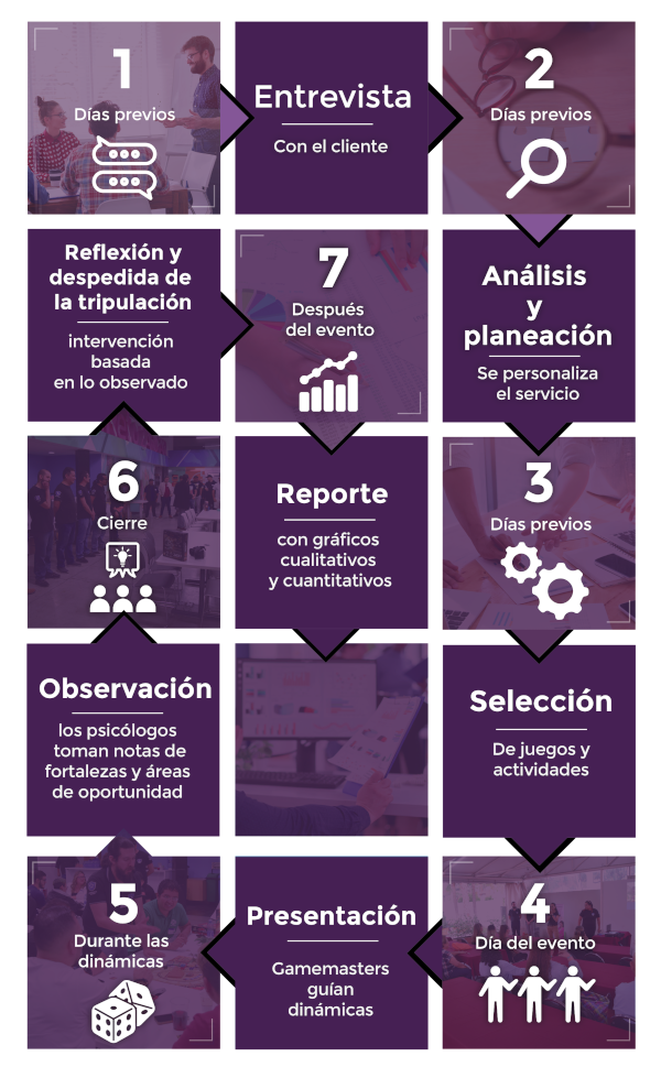 Una sesión diseñada por nuestro equipo de psicólogos que se encargan de planear un ambiente de sana convivencia en el que los participantes puedan conocerse, vincularse e integrarse como un equipo.