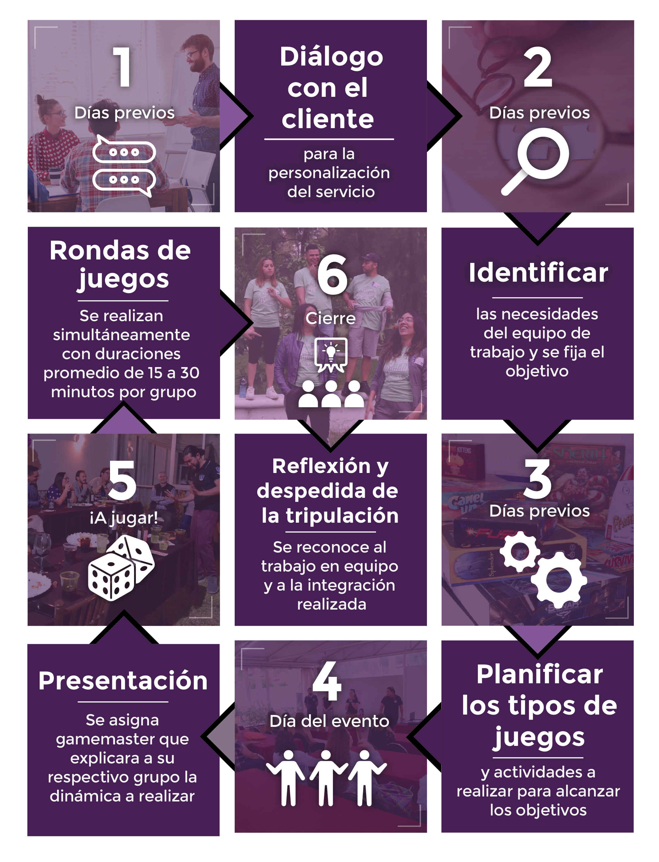 Creamos un ambiente de diversión con una amplia variedad de juegos de mesa a cargo de nuestros Game Masters: expertos facilitadores de juegos y animadores. Fomenta la diversión y el compañerismo por medio de espacios lúdicos de socialización saludable.